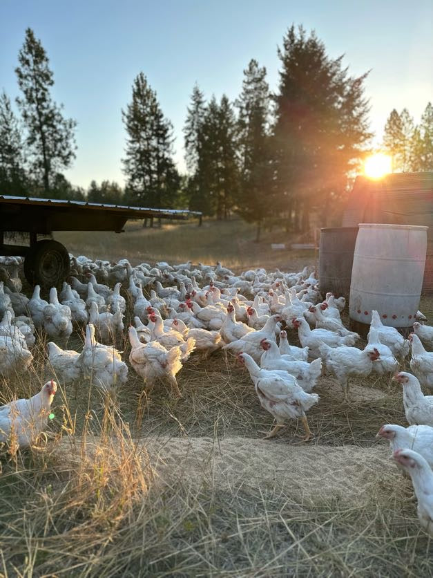 We're located on Yankee Flats road to the west of Armstrong on a plateau above the Salmon River. There's not much out here but rolling pastures, winding roads, and the occasional chicken - and that's just how we like it.